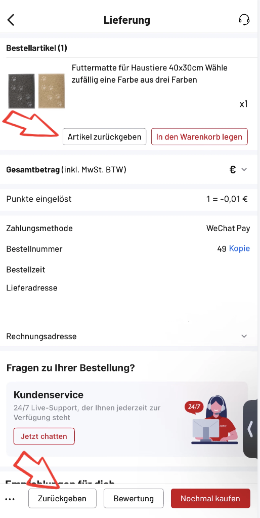 Sobald Sie Ihr Paket erhalten haben und der Bestellstatus „Geliefert” lautet, können Sie eine After-Sales-Anfrage stellen, indem Sie die folgenden Anweisungen befolgen.
