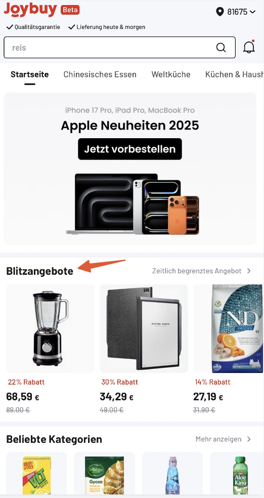 Das Blitzangebot ist auf der Joybuy-Startseite wie unten gezeigt zu finden und zugänglich.