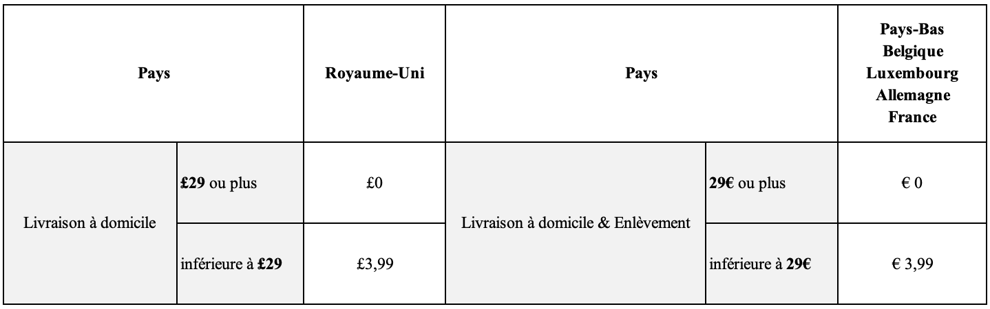 Vous pouvez consulter les règles tarifaires dans le tableau ci-dessous, également visible lors de la commande avant paiement. Les frais d'expédition sont calculés sur le montant réellement payé (hors coupons).