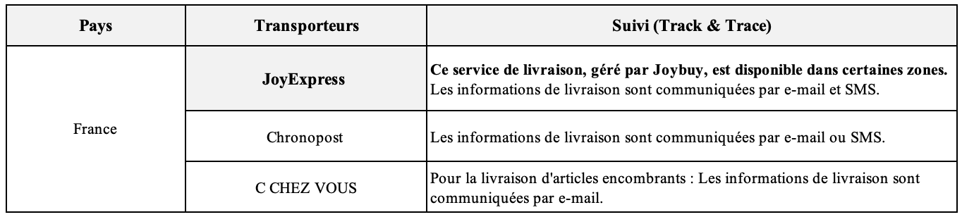 - Régions disposant de la logistique Joybuy – JoyExpress : 1 à 2 jours.