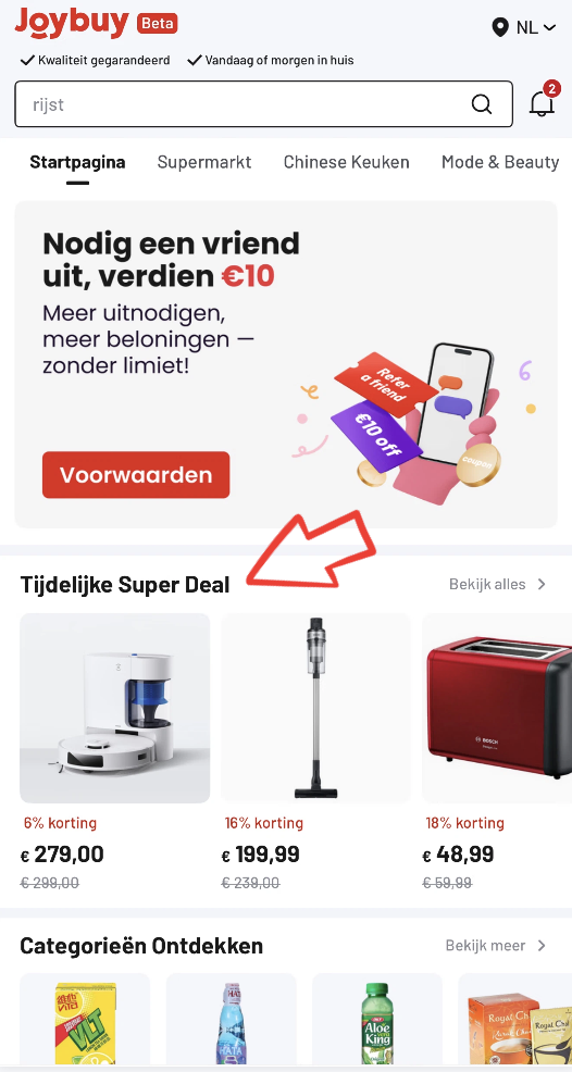De Flitsaanbieding is te vinden en toegankelijk op de Joybuy-startpagina zoals hieronder weergegeven.